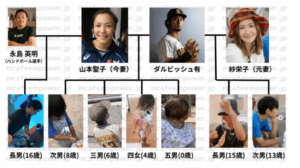 また、山本聖子の前夫との間に生まれた子供1人、さらにダルビッシュ有の前妻との間にもうけた2人の子供もおり、あわせて7人の子供たちと共に暮らしています。