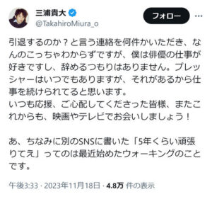 一部のネット上では「三浦貴大さんが引退したのではないか?」という声も見られますが、これは誤解であり、彼は現在も芸能活動を続けています。